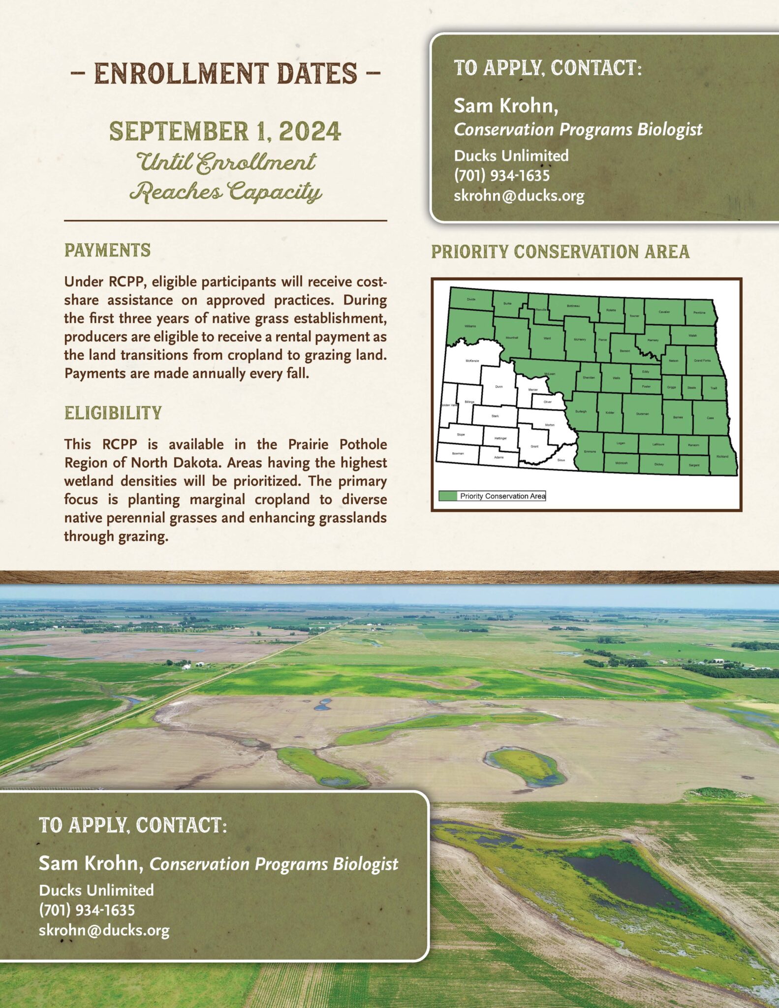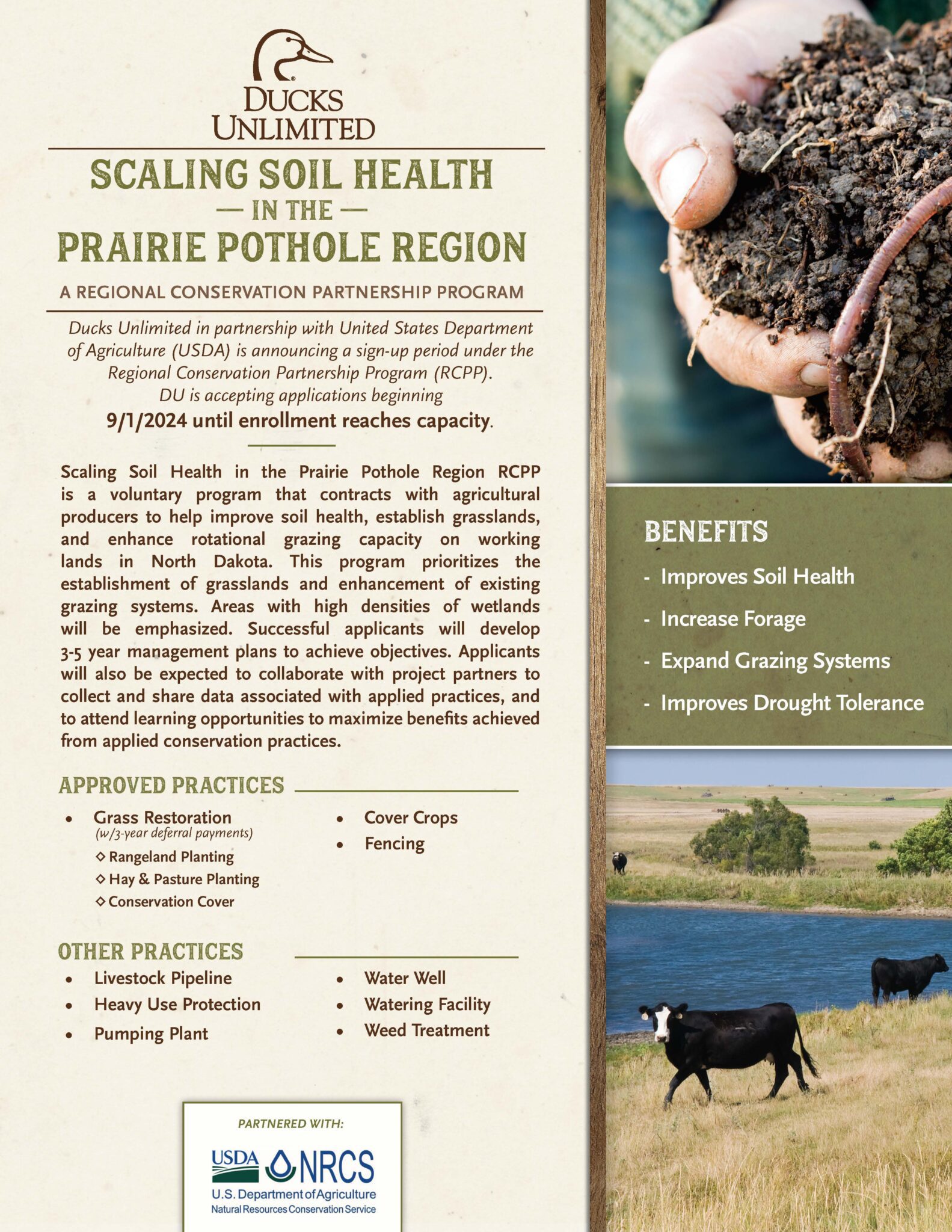 Scaling Soil Health in the Prairie Pothole Region is a voluntary program that contracts with agricultural producers to help improve soil health, establish grasslands, and enhance rotational grazing capacity on working lands in North Dakota. This program prioritizes the establishment of grasslands and enhancement of existing grazing systems. Areas with high densities of wetlands will be emphasized. Successful applicants will develop 3-5 year management plans to achieve objectives. Applicants will also be expected to collaborate with project partners to collect and share data associated with applied practices, and to attend learning opportunities to maximize benefits achieved from applicated conservation practices.